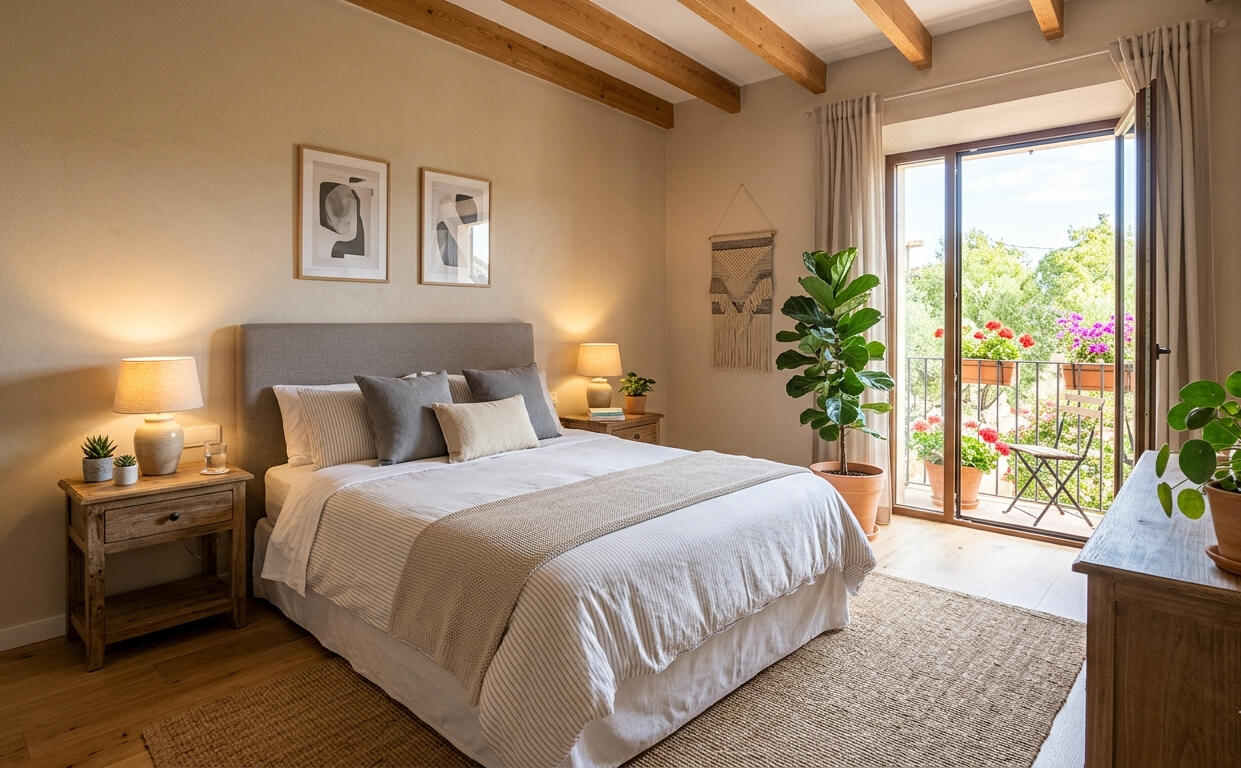 This spacious bedroom, ideal for couples, stands out for its natural light thanks to the large French door leading to a private balcony with a view of the greenery. The environment is welcoming and comfortable, with a large double bed, two nightstands with lamps, plants adding a touch of nature, and a relaxing atmosphere.Regarding the amenities offered, guests will find clean linens and bed sheets, a refreshment area with a coffee machine, snacks, and a kettle for preparing hot drinks, and a modern and functional private bathroom.