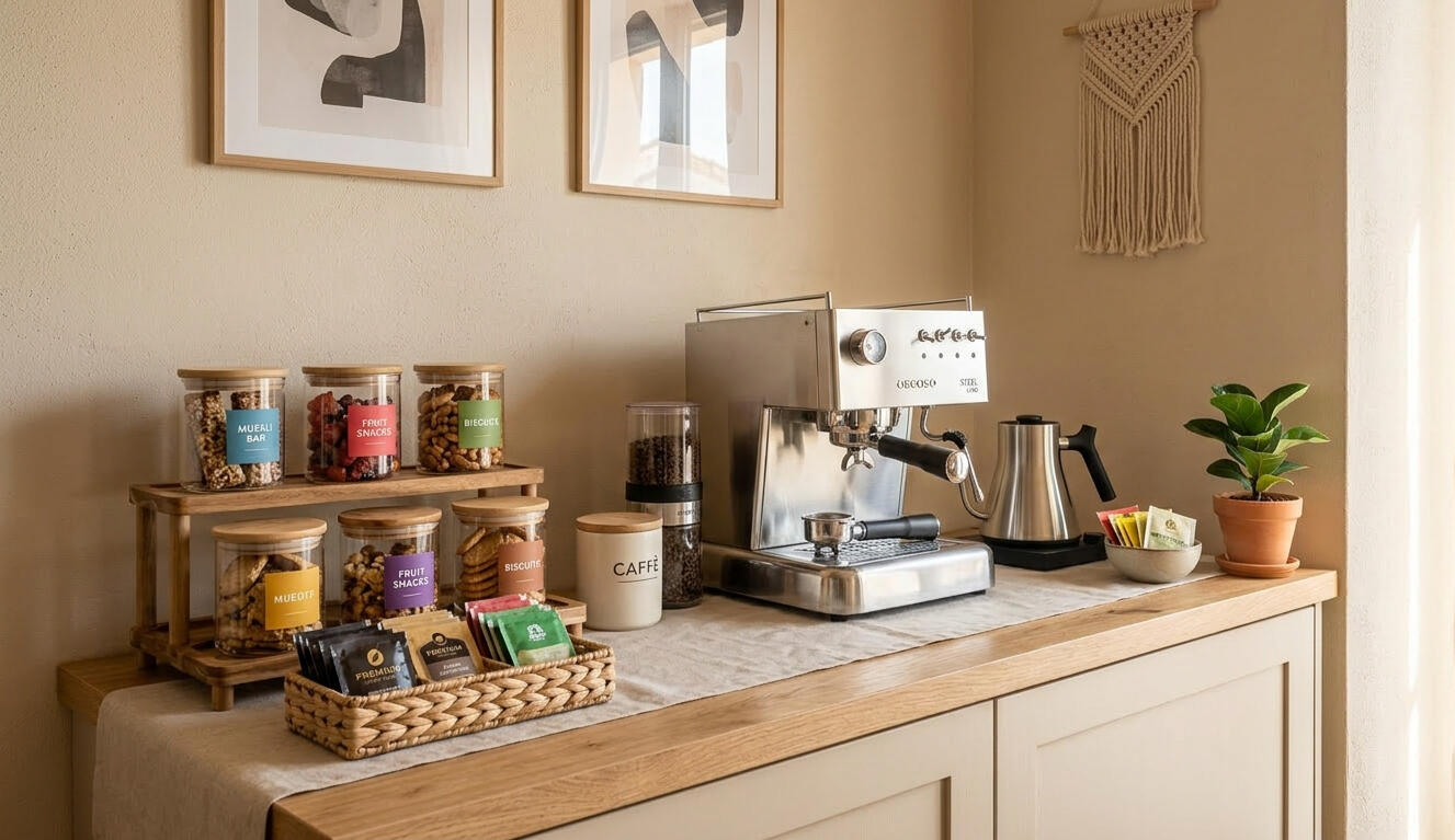 A small shared space with a microwave, kettle, coffee machine, and toaster.Please clean up